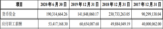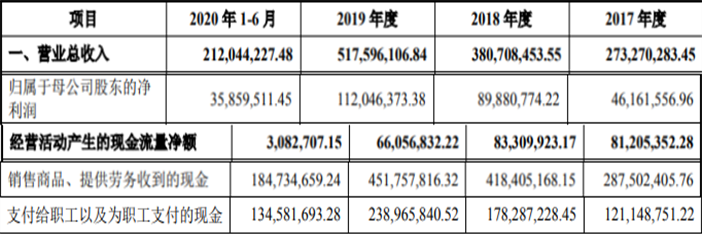 2017年至2020年1-6月,公司营业收入分别实现2.73亿元、3.81亿元、5.18亿元、2.12亿元;归母净利润分别为4616.16万元、8988.08万元、1.12亿元、3585.95万元;经营活动产生的现金流量净额分别为8120.54万元、8330.99万元、6605.68万元、308.27万元;销售商品、提供劳务收到的现金分别为2.88亿元、4.18亿元、4.52亿元、1.85亿元;支付给职工以及为职工支付的现金分别为1.21亿元、1.78亿元、2.39亿元、1.35亿元。