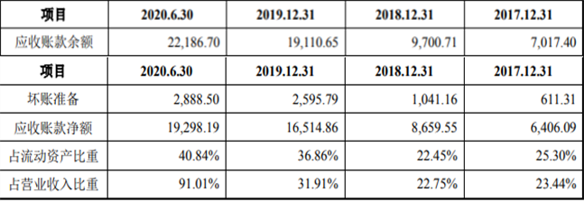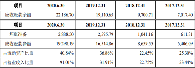 招股书显示,报告期各期末,奥雅设计应收账款净额分别为6406.09万元、8659.55万元和16514.86万元,占流动资产的比重分别为25.30%、22.45%和36.86%,占营业收入的比例分别为23.44%、22.75%和31.91%。
