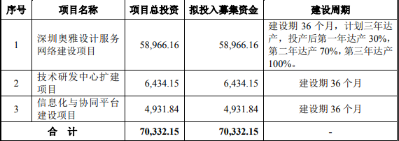 奥雅设计最终募集资金净额较原计划多1127.24万元。招股说明书显示,公司拟募集资金7.03亿元,分别用于深圳奥雅设计服务网络建设项目、技术研发中心扩建项目、信息化与协同平台建设项目。